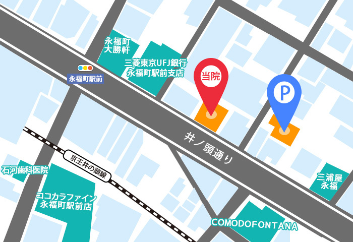 当院、明大前方面1つ目の交差点左に入ってすぐにコインパーキングがあります。